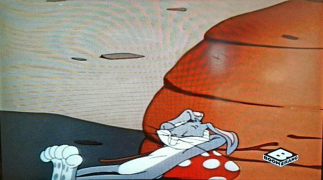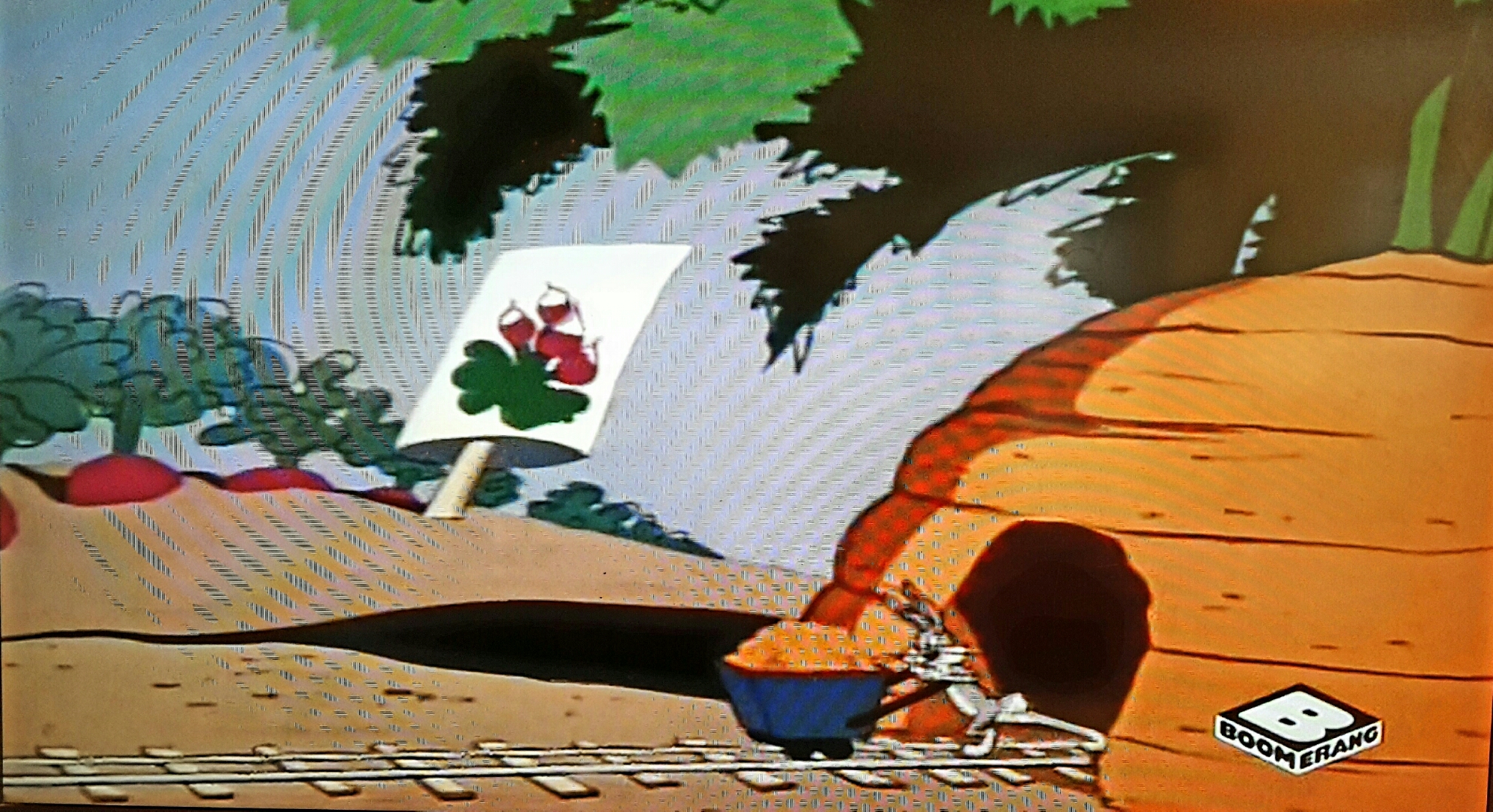 Finally, his sense of smell kicks in. Thinking he smells carrot, Bugs looks around, figures he’s discovered a carrot mine and, in true cartoon style, has carved out a mining rail system in a matter of minutes and is hauling out bits of carrot.